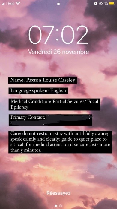 Paxton had a seizure while on public transit and was able to get the help she required thanks to having the information needed to assist her as the background image on the lockscreen of her smartphone. An image of her lockscreen can be found below: